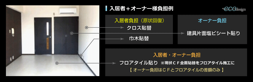 例えば、原状回復後に改めて施工すると工事費が36万円となる所を、半分以下の17万円でデザインルームにする事が可能となります。